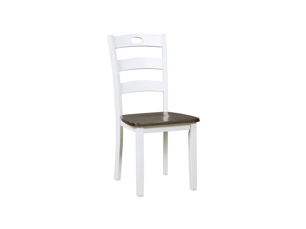 Made with Birch veneers and select hardwood solids in a distinctive two-tone cottage finish. Cream table base and chair frame with medium brown color table tops and chair seats. Updated cottage styling, table has arched aprons and chair has pierced ladder back design. Chair has contoured seat for added comfort. D335-15 small round dining table features drop leaves for smaller space dining. Chair has a pierced ladder-back design.