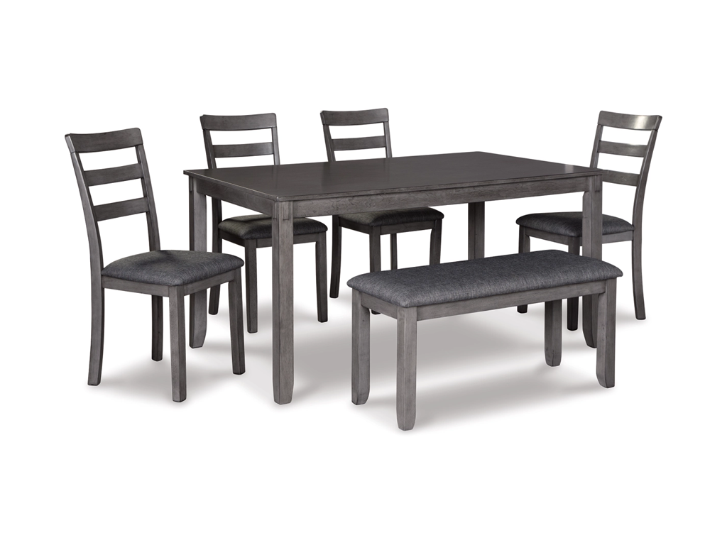It’s so easy being gray—at least the Bridson 6-piece dining set makes it seem that way. This transitional dining table set sports a charcoal gray finish with textured gray upholstery for an on-trend and relevant appeal. Plushly upholstered seat cushions in a practical polyfiber make it a pleasure to linger at the table. Brilliantly styled seating choices add interest and versatility at mealtime.