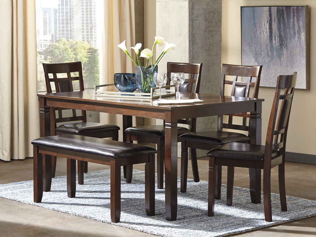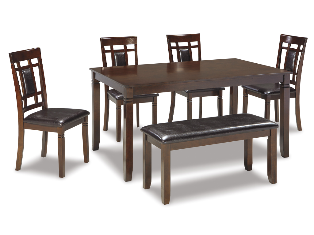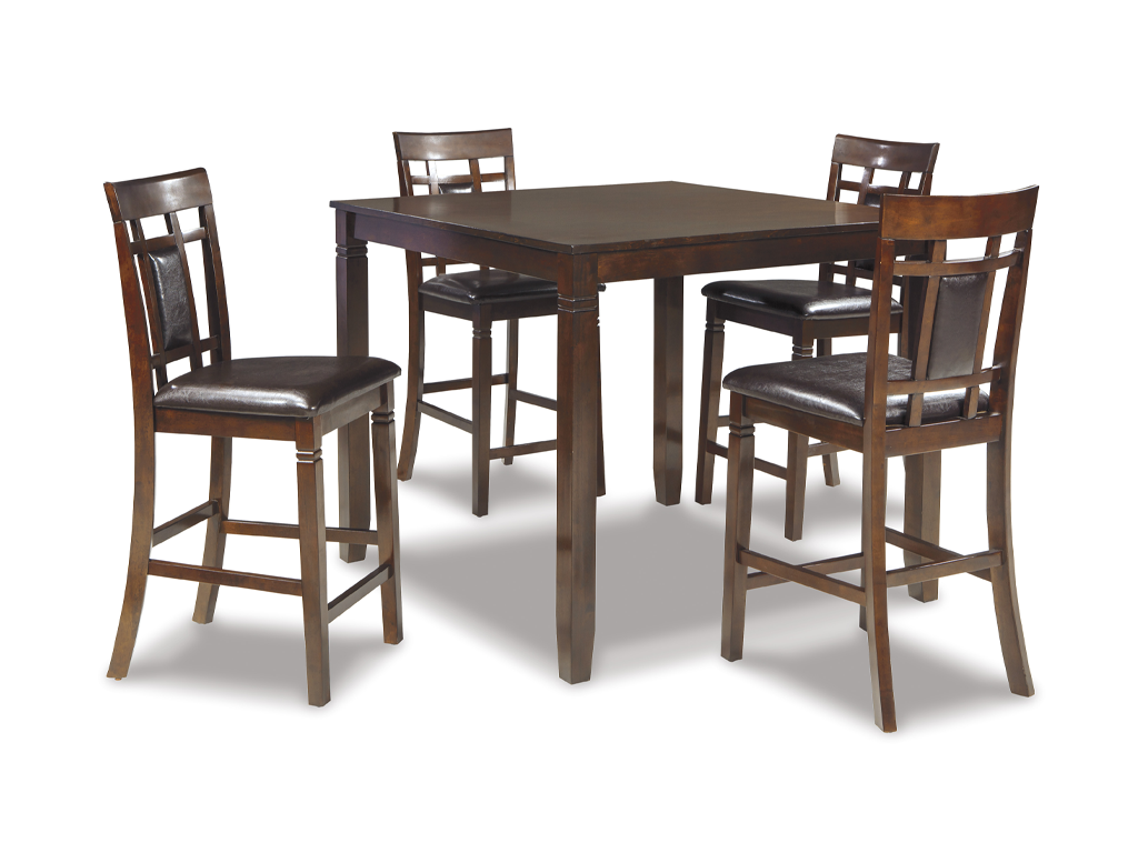 Set the scene for cool, comfortable and ultra-contemporary style with this dining table set. The counter height design makes eating in feel more like dining out at a trendy pub. Richly upholstered in a practical faux leather with welcome back supports, the four bar stools are sure to satisfy. Set the scene for ultra-contemporary style with this dining room table set. The table’s rich, dark finish and clean, gently tapered profile are the epitome of great taste. With a cutout design, upholstered seats and back supports, the chairs are a cut above. And the addition of an upholstered bench incorporates a generous helping of casually cool flair. Available as a 5pc counter height or a 6pc bar height. See store for details.