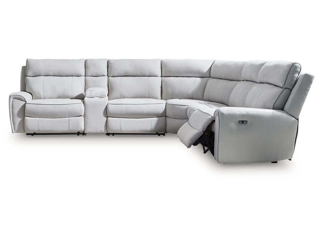 Smart, clean and ultra modern, this power reclining sectional is utterly in vogue. You'll love its indulgent cushions and contemporary bustle back styling. The sumptuous fabric, accentuated with contrasting welting, easily blends with your decor. Convenient consoles with storage and cup holders keep essentials handy. And with reclining at the press of a button, this modular sectional proves chic design and superb comfort go hand in hand.