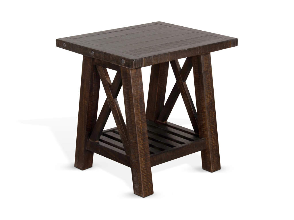 This Vivian Collection occasional set is a simple and yet dynamic and intricate design. The use of straight sections and cross-side stretched panels adds a simple complexity that makes it unique and suitable for most contemporary or transitional modern decor. Built with rough sawn mahogany solids and veneer tops, metal accents, and bottom shelves.